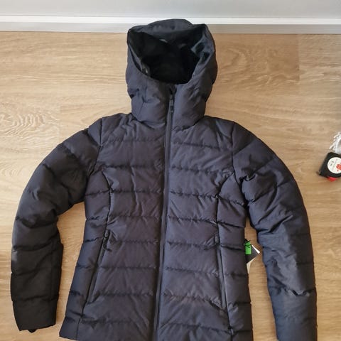 Uudenveroinen untuvatakki karvareunuksisella hupulla.