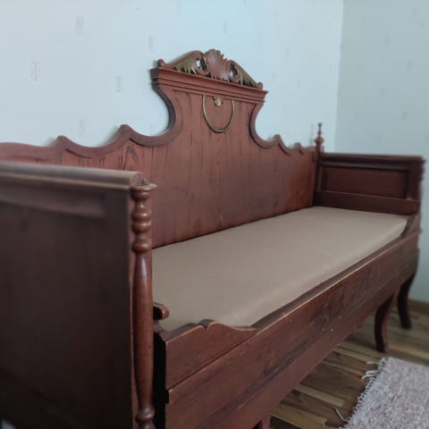 Antiikkinen puinen sohvasänky koristeellisella selkänojalla