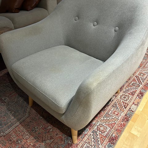 Melko hyvä kunto, käsinojissa kulumaa jonkin verran. Jalat ovat vähän vaikea säätää oikeaan asentoon (kuva), mutta on kuitenkin ihan tukeva eikä keiku.