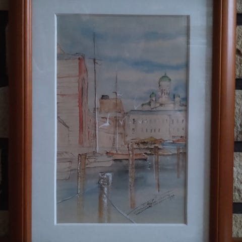 Kolme pientä (kahden kehykset 34 x 25 cm, yksi aavistuksen isompi) akvarellikuvaa Pariisista. Paperi jonkin verran kellastunut, yhdessä kosteustahraakin, mutta kuvat itsessään ihan siistit. Saman tekijän signeeraus kaikissa, tuntematon tekijä. Hinta kaikki kolme yhteensä.
