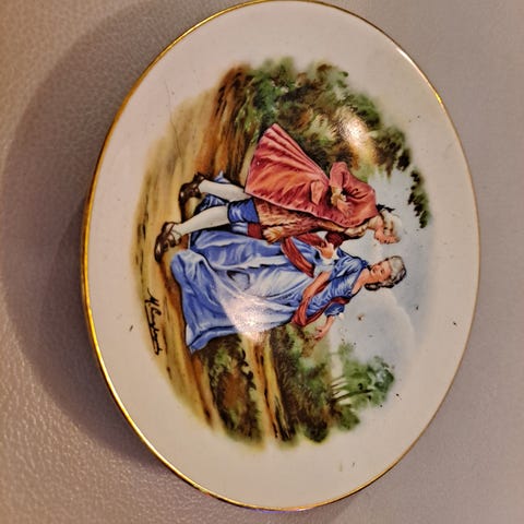 Mallorca koristeellinen posliinilautanen, jossa on värikäs maisemakuva ja perinteisiä hahmoja. Lautanen soveltuu koriste-esineeksi tai keräilykohteeksi.