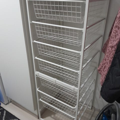 Myyntiin kuin uusi valkoinen 4:n korin korihylly. Hyllyssä myös kansi. Tallessa mukana tulleet kilkkeet (ehkä seinäkiinnitys&pinoaminen).