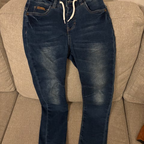 Rennot siniset farkut, relaxed fit, koko 134. Vyötäröllä kiristyskuminauha. Etu- ja takataskut. Materiaali 99% puuvillaa, 1% elastaania.