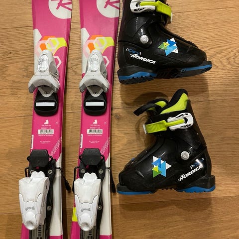 Rossignol laskettelusukset 80cm, sauvat 70 cm ja Alpina monot koko n. 27. Monojen pohjassa lukee 165-175, 217 mm.