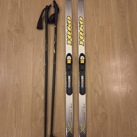 Hyvät sukset nuorelle hiihtäjälle. Suksien pituus 120cm, eli noin 115cm molemmin puolin olevalle hiihtäjälle. Helpot myös vanhemmalle, kun ei tarvitse pitovoiteita ja karvapohja toimii paljon paremmin kuin suomupohja. Pieniä käytön jälkiä pohjassa ja naarmu toisen suksen kannassa. Prolink-side käy Prolink, NNN ja Turnamic monoihin.