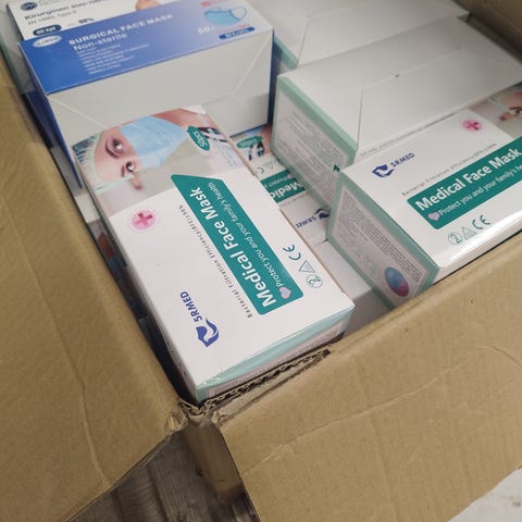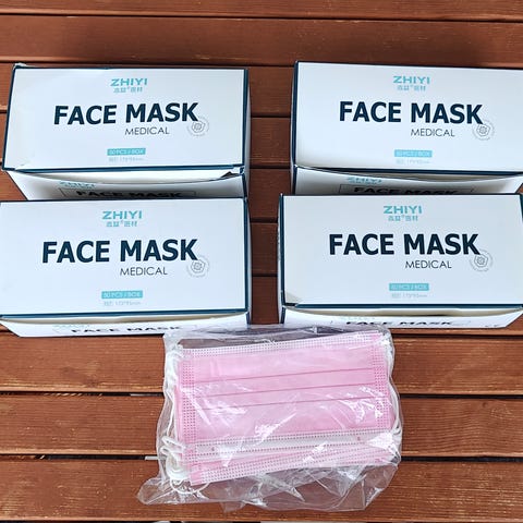 Kirurgisia suu- ja nenäsuojia (type IIR) mustana, kaksi pakettia, yhteensä 100kpl. Paketit avaanattomia. Ffp2 hengityksensuojain 10kpl, yksittäispakattuja. Lisäksi Medenta antimikrobinen kasvosuojain mikrokuidusta, Käyttämätön.
