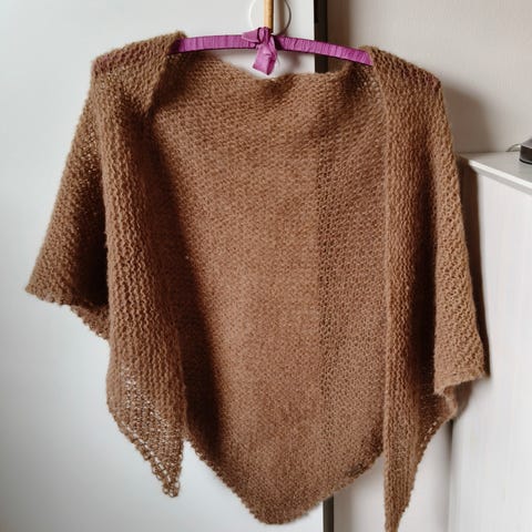 Kuvan kolmiohuivi myynnissä, koko n. 80x200cm, uusi, pehmeä ruskea sävyinen lanka. Hinta 30 euroa.