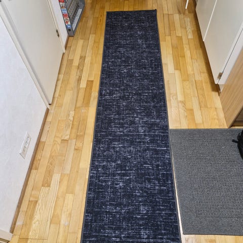Annetaan käytävä-/eteismatto. Koira on syönyt yhtä matonkulmaa ja pikkuisen ehkä toistakin ks. kuvat.