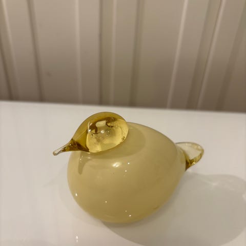 Oiva Toikan suunnittelema Tirri. Suupuhallettua lasia. Pohjassa kaiverrus O. Toikka Nuutajärvi