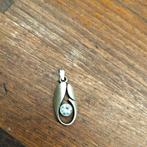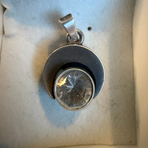 Kari Laineen suunnittelema riipus, vintagea. Halkaisija n. 1,5 cm, ajan patinaa, säilytetty rasiassaan. Hopeaa, kivi vuorikristallia.