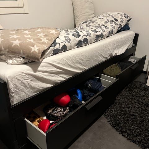 Pieniä käytönjälkiä on, ne näkyy kuvissa. Rungon osia korjattu asiallisesti kulmaraudalla, ei näy päällepäin. Pohjan säleet kaikki ehjiä. Ei patjoja.