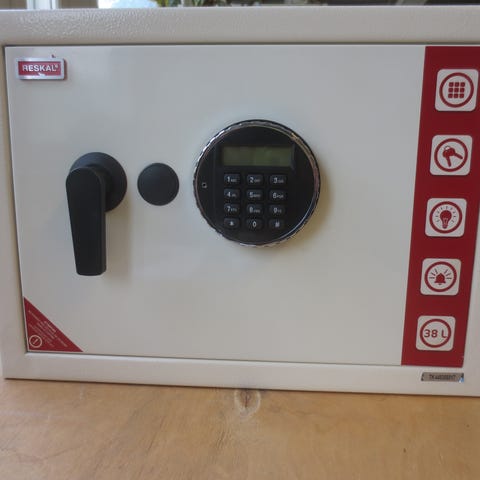 Amsec kassakaappi, jossa on sähköinen lukko. Sisältää säädettävät hyllyt ja sisäisen lokeron. Suunniteltu asiakirjojen ja arvoesineiden turvalliseen säilytykseen.