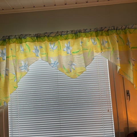 2 samanlaista verhoa. Hyvässä kunnossa, ainoastaan tankokuja rispaantunut molemmissa verhoissa (näkyy kuvassa).