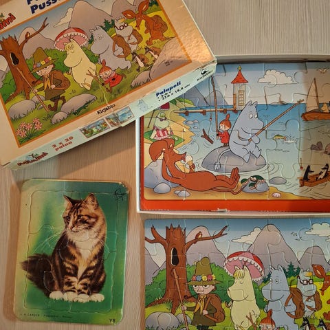 Muumipalapeli. Laatikko vähän kärsinyt, mutta palapelit kunnossa.