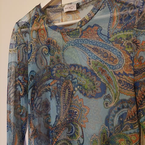 US ostettu kaunis patterikuosinen ja kirjailtu pusero. Olkapäät avoimet. Joustava kangas. Pari kertaa käytetty.