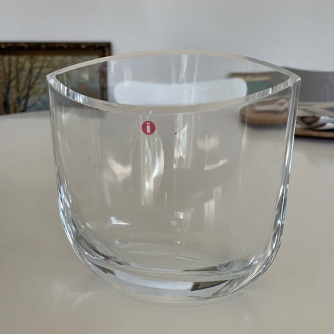 Käsin puhallettu lasi maljakko, mahdollisesti ovalis sarjaa. Koko 20x6.5cm, korkeus 16cm.