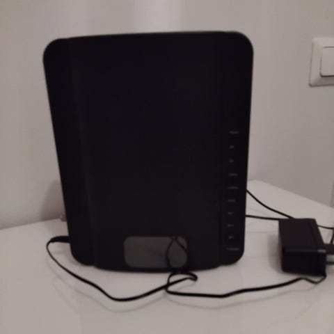 Arris modeemi reititin mustassa värissä. Laite sisältää useita Ethernet-portteja ja virtalähteen. Sopii kotikäyttöön internet-yhteyden jakamiseen.