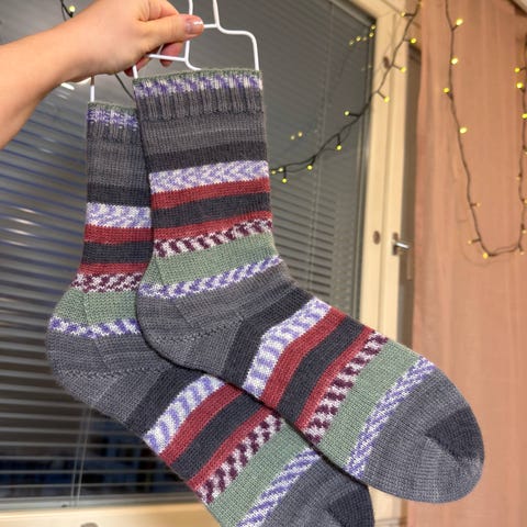 Kirjavat villasukat, koko M. Sukat on valmistettu villasta ja niissä on monivärinen kuviointi. Sopivat käytettäväksi lämpiminä jalkineina tai sisäsukkina.