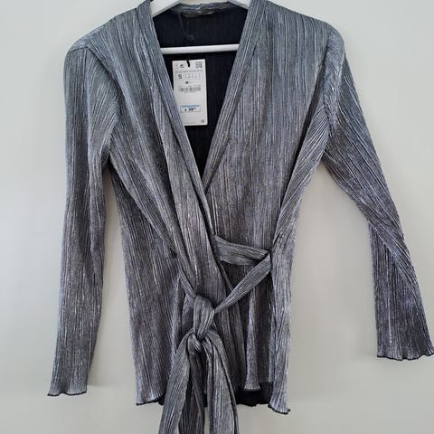 Kauniisti laskeutuva juhla/toimistopaita, jonka voi sitoa muutamalla eri tavalla vyötärön nauhoilla. Kauniit leveät hihat. Edessä yksityiskohtana pieni ”viilto” kaula-aukkona. Koko S.
