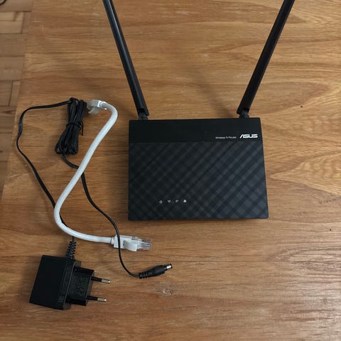 Arris TG2492S reititin mustassa värissä. Laitteessa useita liitäntäportteja ja mukana virtalähde.