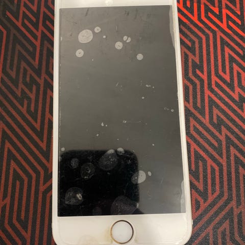 Apple iPhone 6 älypuhelin, jossa on 32 gigatavua tallennustilaa. Puhelimen väri on hopea. Nouto. Ei laturia ja latausjohtoa