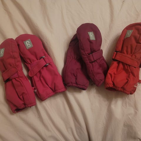 Reiman talvirukkaset, käytetty yhdellä lapsella ahkerasti. Peukaloiden ja kämmenen yläosien saumoissa hieman kulumaa, katso kuva. Ei kuitenkaan puhki, vaan ihan käyttökunnossa. Koiratalous.