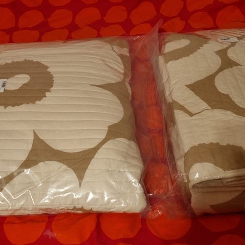 Ihana pari kertaa sängyn päällä koristeena ollut torkkupeitto neulottua materiaalia unikko kuviolla. Väri beige ja toinen puoli vaaleampi.
