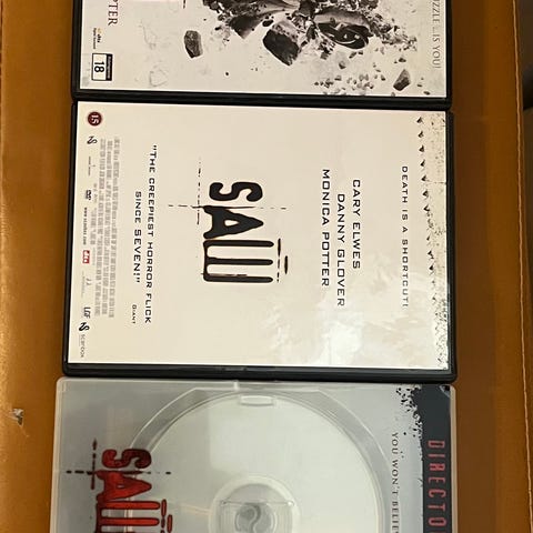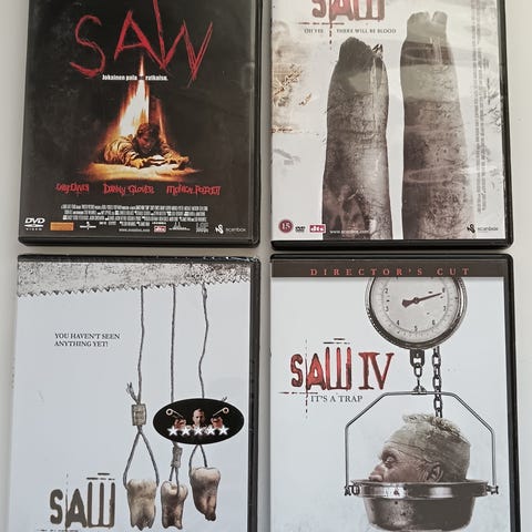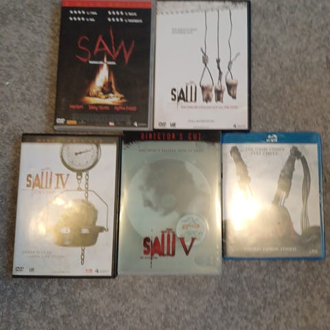 Saw-elokuvasarjan DVD-kokoelma, sisältää useita osia. Elokuvat ovat kauhu- ja trilleri-genreä.