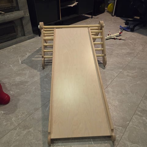 Myydään lasten puinen Triclimb -merkkinen kiipeilykolmio. Rampin toinen puoli on liukumäki ja toisella puolella kiipeilyaskelmat. Rampin saa asetettua eri korkeuksille. Kolmion saa helposti kasaan, joten mahtuu säilyttää esim sängyn alla. Tämä on käytetty, mutta siisti, ehjä ja tukeva seuraavalle. Joitain kolhuja luonnollisesti tullut käytöstä. Ovh noin 460e. Nouto Riihimäeltä.