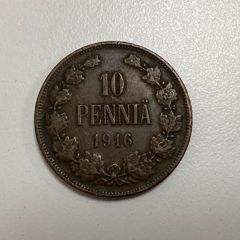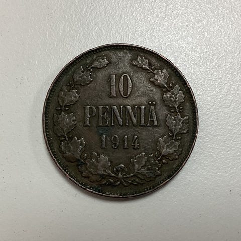 Kuparista valmistetut 10 pennin rahat lyötiin Suuriruhtinaskunnan aikaan vuosina 1865–1917.