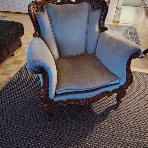 Antiikkinen nojatuoli, jossa on vihreä verhoilu ja puinen runko. Tuolissa on käsinojat ja koristeellinen yläosa selkänojassa. Soveltuu sisustukseen ja istumiseen.