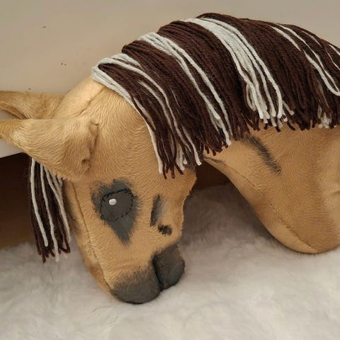Hevonen ommeltu huolellisesti ompelukoneella. Harja, korvat, silmät ja sieraimet kiinnitetty käsin. Korvissa kovikkeet.