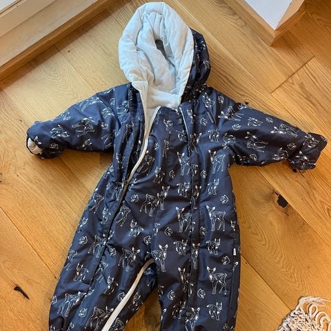 Erittäin hyväkuntoinen äitiyspakkauksen muumi-kuvioinen haalari koossa 68/74. Mukaan villainen kypärälakki 44/46, puuvillainen pipo 0-1v., tumput ja töppöset.