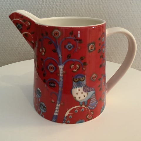 Iittala taika kannu, punainen väri. Astiastoon soveltuva käyttöesine, jossa on kahva ja kaatonokka. Materiaali posliini tai keramiikka. Virheetön. Tarra paikallaan.