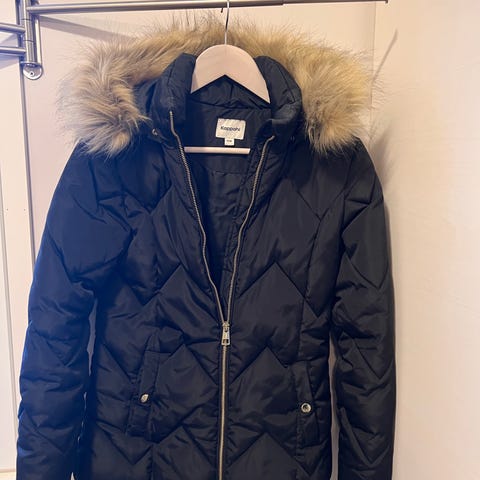 Hyväkuntoinen koululaisten talvitakki koko 158. Takissa pörröhuppu ja kiristysnyöri vyötäröllä.