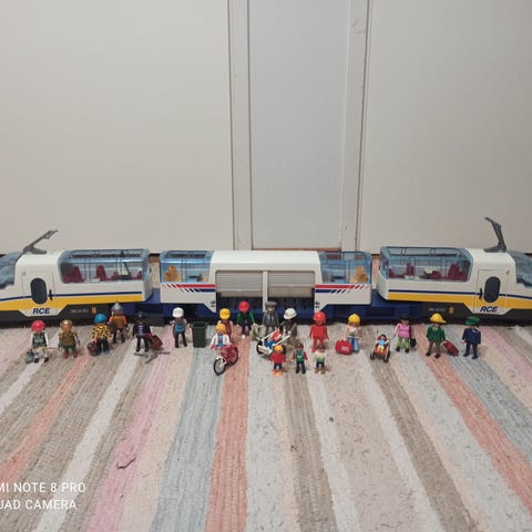 Playmobil RC Train junasetti sisältää junan, useita henkilöfiguureja, polkupyöriä ja lisäosia kuten kiskoja. Setti tarjoaa erilaisia osia junan rakentamiseen ja leikkiin.