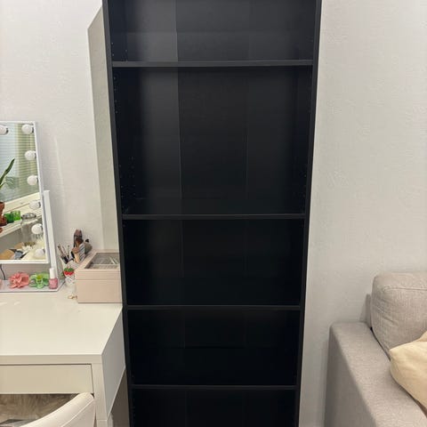 Hyväkuntoinen Billy kirjahylly. 6 hyllylevyä. Hyllyjen paikat helposti siirrettävissä. Yksi hyllyistä on muutettu lisäosalla esitehyllyksi. Lisäosan poistamalla siitä saa normaalin hyllyn tai esitelistaa voi käyttää hyllyn reunana. Nouto Turun Pääskyvuoresta.