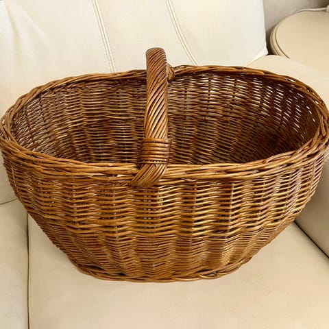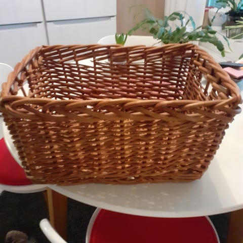 Hyväkuntoinen, muutama pajunvarsi katkennut, näkyy kuvissa. Kankainen sisuspussi nauhakiinnityksellä, irrotettavissa pesua varten.