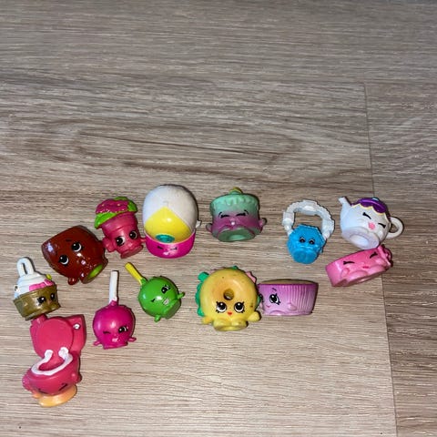 Shopkins keräilyesineet, jotka esittävät erilaisia hedelmä- ja välipalahahmoja. Sisältää hahmoja kuten Pringles-sipsipurkkeja, Pop Tarts -rasioita, hedelmiä ja muita ruokateemaisia miniatyyreja. Hahmot ovat pieniä ja sopivat keräilyyn tai koristeeksi. Myydän yhdessä:)