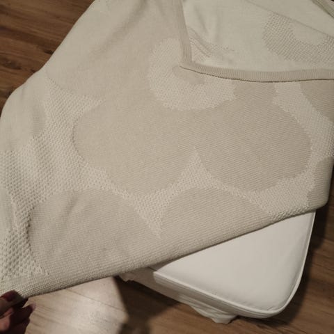 Upea uusi Marimekon räsymatto hempeän vaaleanpunainen torkkupeitto lämmintä villaa.