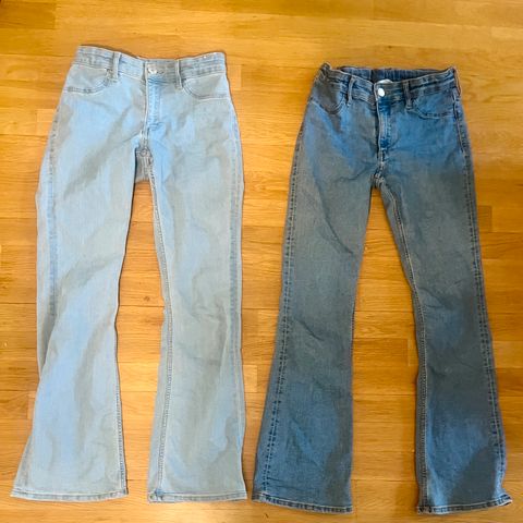 Farkkuja koululaiselle. Parissa mallissa reijät, näistä kuvat. Kolmet kiristettävissä vyötärökaitaleen sisäpuolella olevilla napeilla. Savuton ja eläimetön talous.