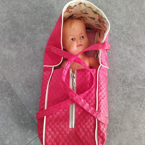 Hyväkuntoinen vanha nukke ja kantokoppa/kantokassi 90-luvulta. Ehjät ja siistit. Nukella pehmeä vaahtomuovi(?) vartalo. Säilytetty lämpimässä.