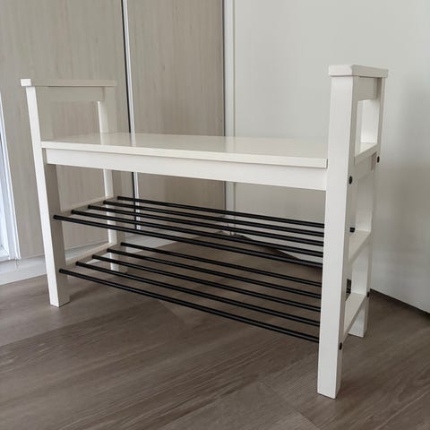Lähes uuden veroinen Ikea Hemnes säilytyspenkki, jossa naulakko tangolla ja neljällä koukulla esimerkiksi eteiseen tai kylpyhuoneeseen. Sisällä säilytystilaa pyyhkeille tai muille tavaroille. Kansi sulkeutuu pehmeästi. Laatikko toimii myös lisäistuimena ja laskutasona. Naulakossa tanko ja nupit/koukut (4 kpl).
