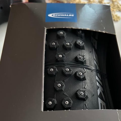 Toisesta renkaasta puuttuu yksi nasta, muuten ovat todella hyväkuntoiset. Ei ole montaa lenkkiä ajettu.