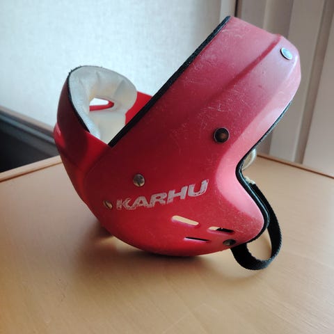 Lapsi kävi kokeilemassa lajia ja oli muutamat treenit päässä. Kokoa en löytänyt mutta 1-4 luokkalaiselle luulisi menevän.