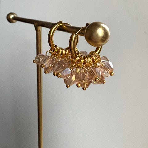 Ruskeat sirot lasihelmi /rypäs- korvakorut korurasiassa. Pituus noin 2,5cm. Kullansävyinen rengas.