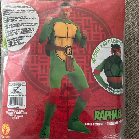 Asua on käytetty vain kerran ja se on L-kokoa. Asussa on rinnan ja olkapäiden kohdalla pehmusteet, jotka korostavat lihaksikasta ulkonäköä. Selässä on irrotettava kilpi. Mukana tulee neljä eriväristä maskia, joten asu sopii useamman Turtles-hahmon esittämiseen.