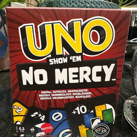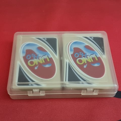 Myynnissä Uno korttipeli. Avaamaton peli (kortit ovat muoveissaan) ja on hyllyssä säilytetty. Pahvipakkaus on pikkasen saanut kulmiinsa kulumaa. Savuton ja eläintalous (=löytyy mahdollisesti eläimen karvoja). MMM.