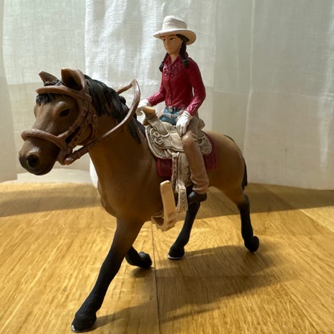 Schleich ratsukko, jossa ratsastaja Elina ja Hannoverinhevonen Donna (Rambon talli).
