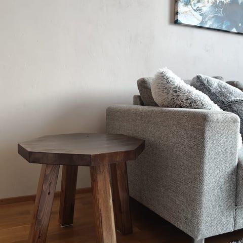 Kahdesta vanhasta pöydästä tehty yksi uusi. Tein pöytään alatason ja käänsin jalat "väärinpäin". Alataso ja jalat ovat vaneria, itse pöytätaso on viilutettua liimapuuta. Eikä aavistustakaan minkä puun viilua, mutta upeat loimut. Kannen viilusta lohjennut noin sentin kokoinen pala ja alkuperäisen tekijän kynämerkkaukset paistavat kannen läpi. Käsitelty pähkinän värisellä puuvahalla.